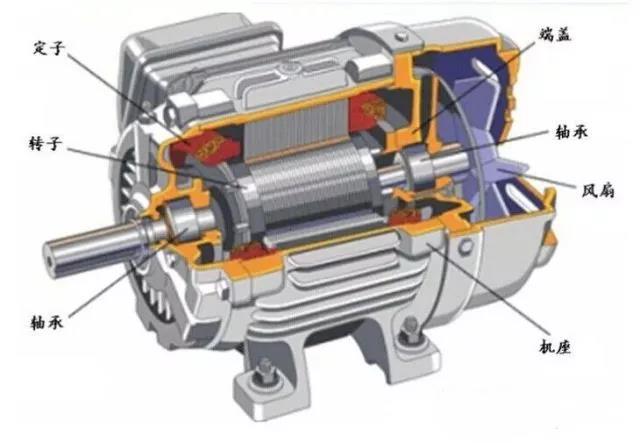 主要包括一个用以产生磁场的电磁铁绕组或分布的定子绕组和一个旋转电枢或转子和其它附件组成。在定子绕组旋转磁场的作用下,其在电枢鼠笼式铝框中有电流通过并受磁场的作用而使其转动。