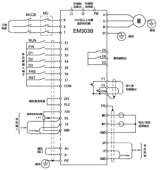 模拟输出 M0 模拟输出端子0 0~10V或0~20mA模拟输出,可通过功能代码F2-16F2-17或F2-19、F2-20的设定选择所代表的含义。